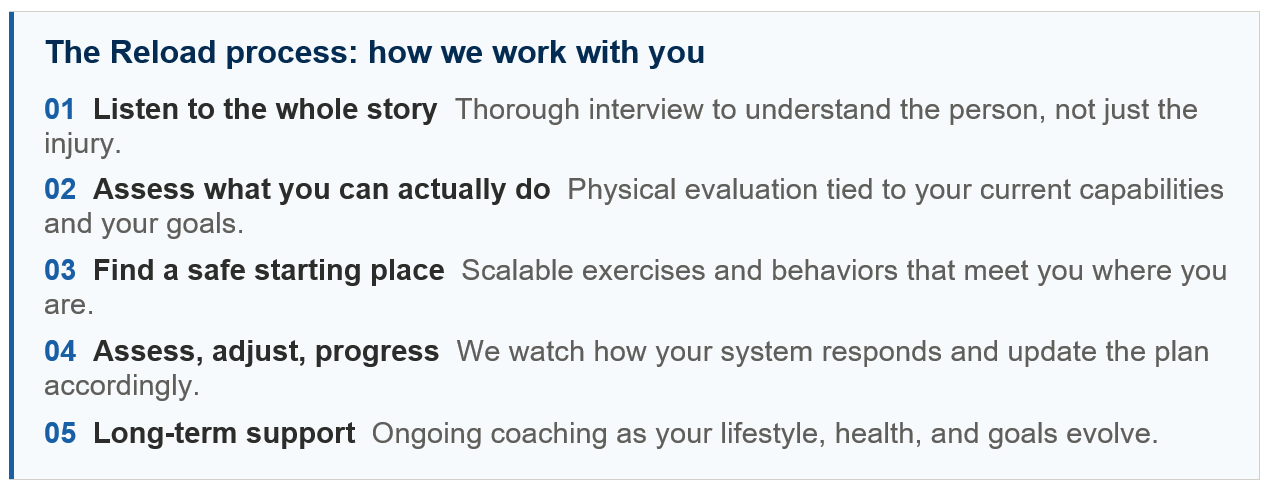 At Reload, we operate from a simple but powerful philosophy: function first, then healthy longevity. We are not interested in abstract health goals 30 years from now. We are interested in helping you do the things that matter to you today, and building the physical and psychological capacity to keep doing them for decades.