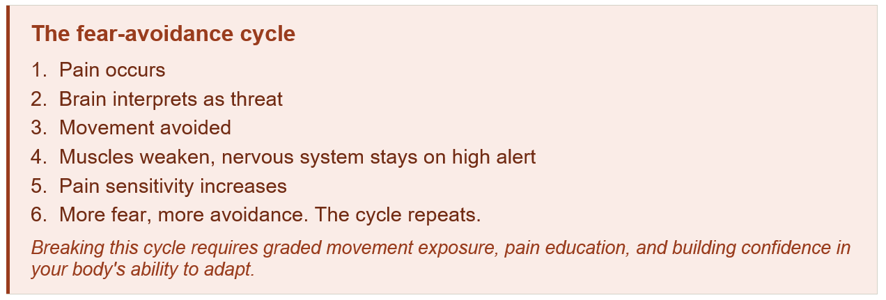 When pain feels threatening, the brain activates a protective response. Movement gets tagged as dangerous. The nervous system becomes more sensitive. And here is the critical insight: avoidance does not reduce pain sensitivity. It increases it.