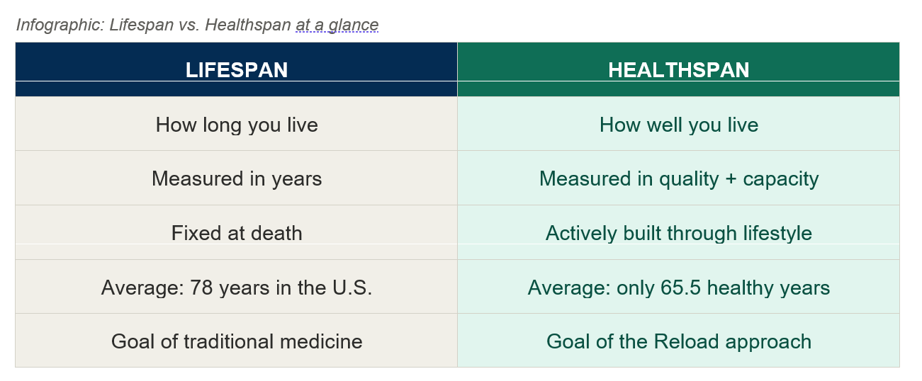 At Reload PT & Fitness in New York City, we work with people every day who are not just trying to extend their lifespan. They are trying to extend their healthspan. And that distinction changes everything about how you approach your health.